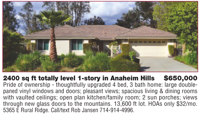 2400 sq ft totally level 1-story in Anaheim Hills $650,000 Pride of ownership - thoughtfully upgraded 4 bed, 3 bath home: large doublepaned vinyl windows and doors; pleasant views; spacious living & dining rooms with vaulted ceilings; open plan kitchen/family room; 2 sun porches; views through new glass doors to the mountains. 13,600 ft lot. HOAs only $32/mo. 5365 E Rural Ridge. Call/text Rob Jansen 714-914-4996.