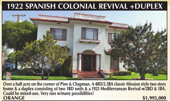 Over a half acre on the corner of Pine & Chapman. A 4BD/2.5BA classic Mission style two story home & a duplex consisting of two 1BD units & a 1923 Mediterranean Revival w/2BD & 1BA. Could be mixed-use. Very rare w/many possibilities! ORANGE $1,995,000