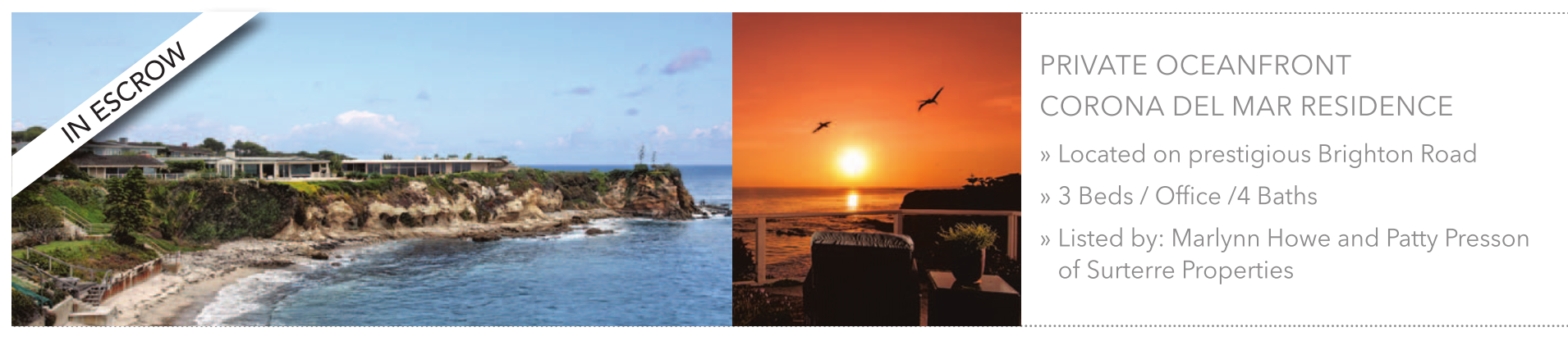 PRIVATE OCEANFRONT CORONA DEL MAR RESIDENCE » Located on prestigious Brighton Road » 3 Beds / Office /4 Baths » Listed by: Marlynn Howe and Patty Presson of Surterre Properties