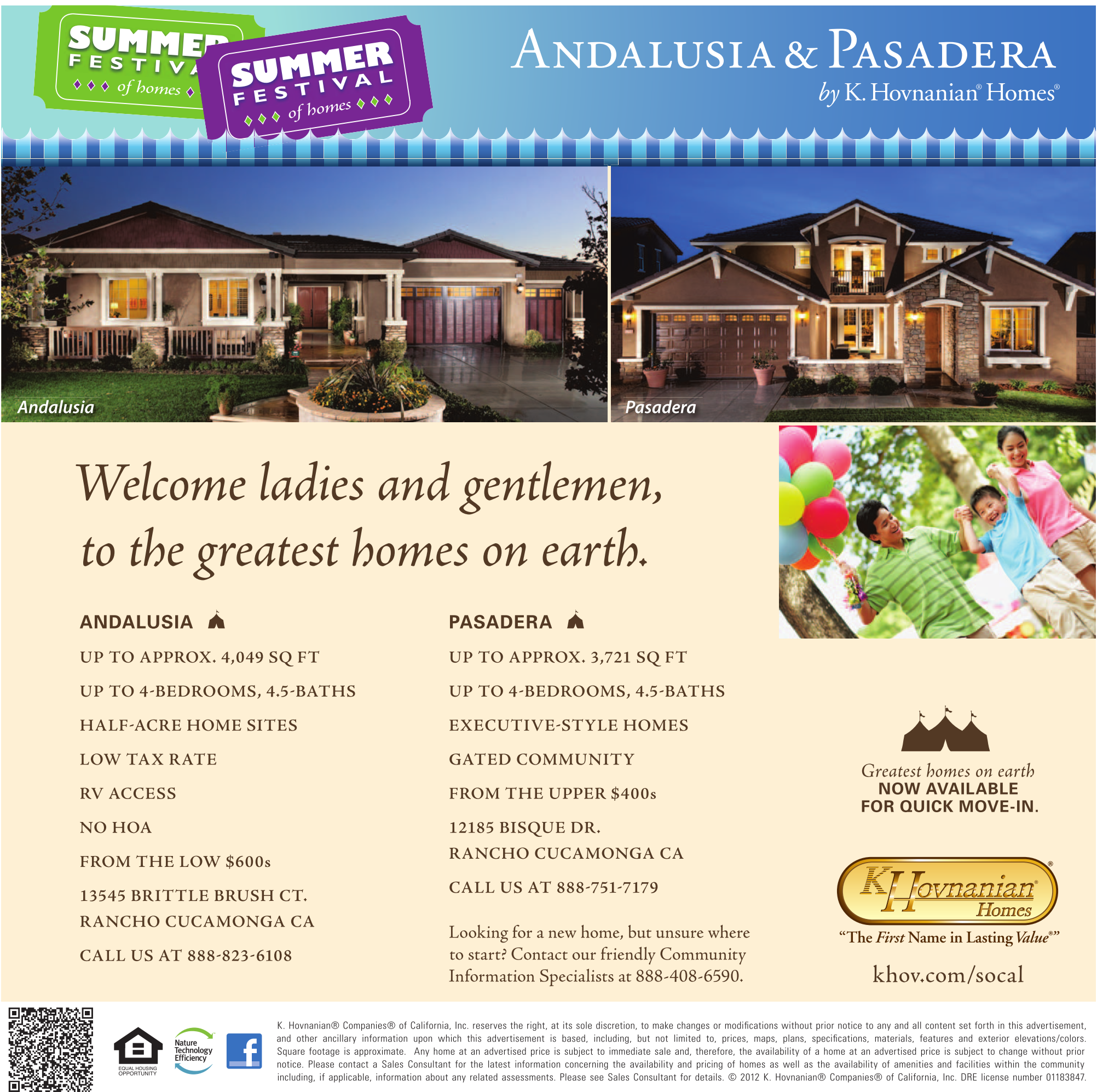 Andalusi a & Pasadera by K. Hovnanian ® Homes ® Andalusia Pasadera Welcome ladies and gentlemen, to the greatest homes on earth. ANDALUSIA PASADERA UP TO APPROX. 4,049 SQ FT UP TO APPROX. 3,721 SQ FT UP TO 4-BEDROOMS, 4.5-BATHS UP TO 4-BEDROOMS, 4.5-BATHS HALF-ACRE HOME SITES EXECUTIVE-STYLE HOMES LOW TAX RATE RV ACCESS NO HOA FROM THE LOW $600s 13545 BRITTLE BRUSH CT. RANCHO CUCAMONGA CA CALL US AT 888-823-6108 GATED COMMUNITY FROM THE UPPER $400s 12185 BISQUE DR. RANCHO CUCAMONGA CA CALL US AT 888-751-7179 Looking for a new home, but unsure where to start? Contact our friendly Community Information Specialists at 888-408-6590. Greatest homes on earth NOW AVAILABLE FOR QUICK MOVE-IN. khov.com/socal K. Hovnanian® Companies® of California, Inc. reserves the right, at its sole discretion, to make changes or modifi cations without prior notice to any and all content set forth in this advertisement, and other ancillary information upon which this advertisement is based, including, but not limited to, prices, maps, plans, specifi cations, materials, features and exterior elevations/colors. Square footage is approximate. Any home at an advertised price is subject to immediate sale and, therefore, the availability of a home at an advertised price is subject to change without prior notice. Please contact a Sales Consultant for the latest information concerning the availability and pricing of homes as well as the availability of amenities and facilities within the community including, if applicable, information about any related assessments. Please see Sales Consultant for details. © 2012 K. Hovnanian® Companies® of California, Inc. DRE license number 01183847.