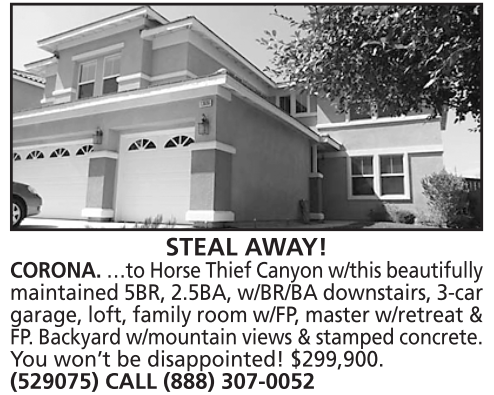 STEAL AWAY! CORONA. …to Horse Thief Canyon w/this beautifully maintained 5BR, 2.5BA, w/BR/BA downstairs, 3-car garage, loft, family room w/FP, master w/retreat & FP. Backyard w/mountain views & stamped concrete. You won’t be disappointed! $299,900. (529075) CALL (888) 307-0052