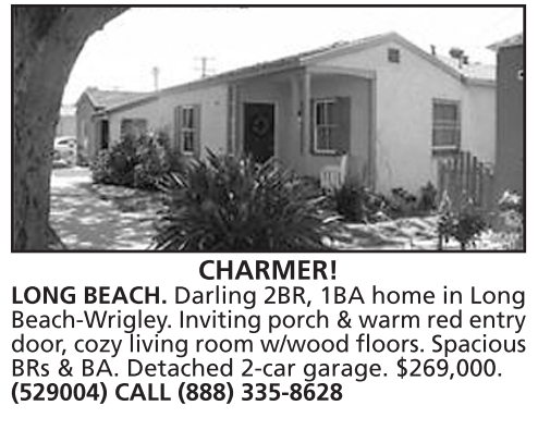 LONG BEACH. Darling 2BR, 1BA home in Long Beach-Wrigley. Inviting porch & warm red entry door, cozy living room w/wood floors. Spacious BRs & BA. Detached 2-car garage. $269,000. (529004) CALL (888) 335-8628