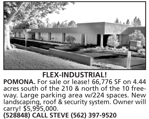 FLEX-INDUSTRIAL! POMONA. For sale or lease! 66,776 SF on 4.44 acres south of the 210 & north of the 10 freeway. Large parking area w/224 spaces. New landscaping, roof & security system. Owner will carry! $5,995,000. (528848) CALL STEVE (562) 397-9520