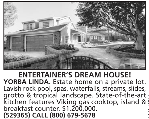ENTERTAINER’S DREAM HOUSE! YORBA LINDA. Estate home on a private lot. Lavish rock pool, spas, waterfalls, streams, slides, grotto & tropical landscape. State-of-the-art kitchen features Viking gas cooktop, island & breakfast counter. $1,200,000. (529365) CALL (800) 679-5678