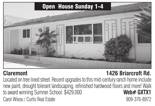 Open House Sunday 1-4 Claremont 1426 Briarcroft Rd. Located on tree lined street. Recent upgrades to this mid-century ranch home include new paint, drought tolerant landscaping, refinished hardwood floors and more! Walk to award winning Sumner School. $429,000 Web# GXTX1 Carol Wiese / Curtis Real Estate 909-376-8972
