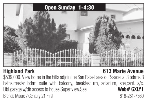 Open Sunday 1-4:30 Highland Park 613 Marie Avenue $539,000. View home in the hills adjoin.the San Rafael area of Pasadena. 3 bdrms,3 baths,master bdrm suite with balcony, breakfast rm, solarium, spa,cent. a/c. Dbl.garage w/dir access to house.Super view.See! Web# GXLY1 Brenda Mauro / Century 21 First 818-281-7360