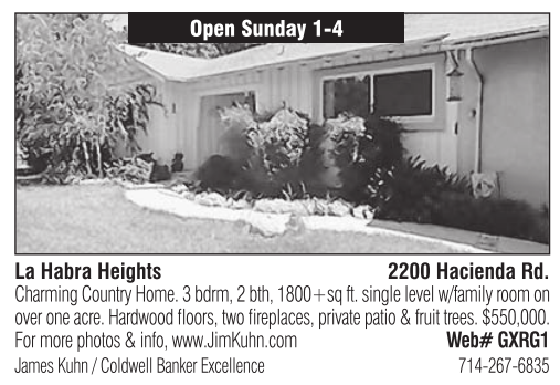 Open Sunday 1-4 James Kuhn / Coldwell Banker Excellence 714-267-6835 La Habra Heights 2200 Hacienda Rd. Charming Country Home. 3 bdrm, 2 bth, 1800+sq ft. single level w/family room on over one acre. Hardwood floors, two fireplaces, private patio & fruit trees. $550,000. For more photos & info, www.JimKuhn.com Web# GXRG1 See also