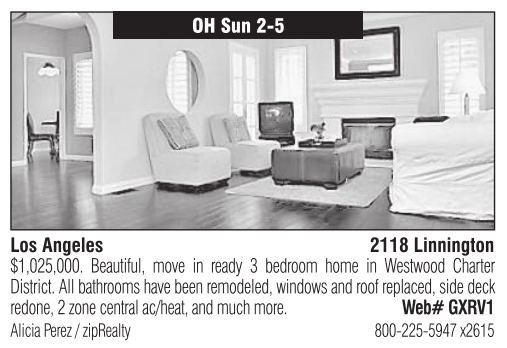 Alicia Perez / zipRealty OH Sun 2-5 800-225-5947 x2615 Los Angeles 2118 Linnington $1,025,000. Beautiful, move in ready 3 bedroom home in Westwood Charter District. All bathrooms have been remodeled, windows and roof replaced, side deck redone, 2 zone central ac/heat, and much more. Web# GXRV1