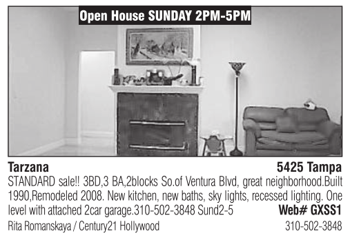 Open House SUNDAY 2PM-5PM Tarzana 5425 Tampa STANDARD sale!! 3BD,3 BA,2blocks So.of Ventura Blvd, great neighborhood.Built 1990,Remodeled 2008. New kitchen, new baths, sky lights, recessed lighting. One level with attached 2car garage.310-502-3848 Sund2-5 Web# GXSS1 Rita Romanskaya / Century21 Hollywood 310-502-3848