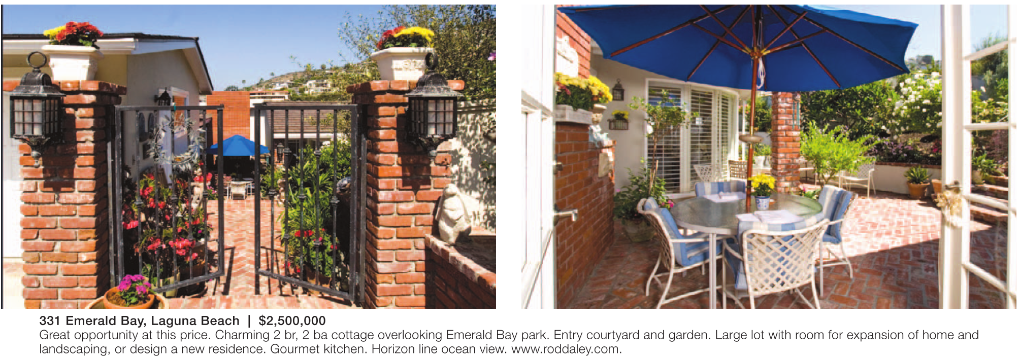 331 Emerald Bay, Laguna Beach | $2,500,000 Great opportunity at this price. Charming 2 br, 2 ba cottage overlooking Emerald Bay park. Entry courtyard and garden. Large lot with room for expansion of home and landscaping, or design a new residence. Gourmet kitchen. Horizon line ocean view. www.roddaley.com.