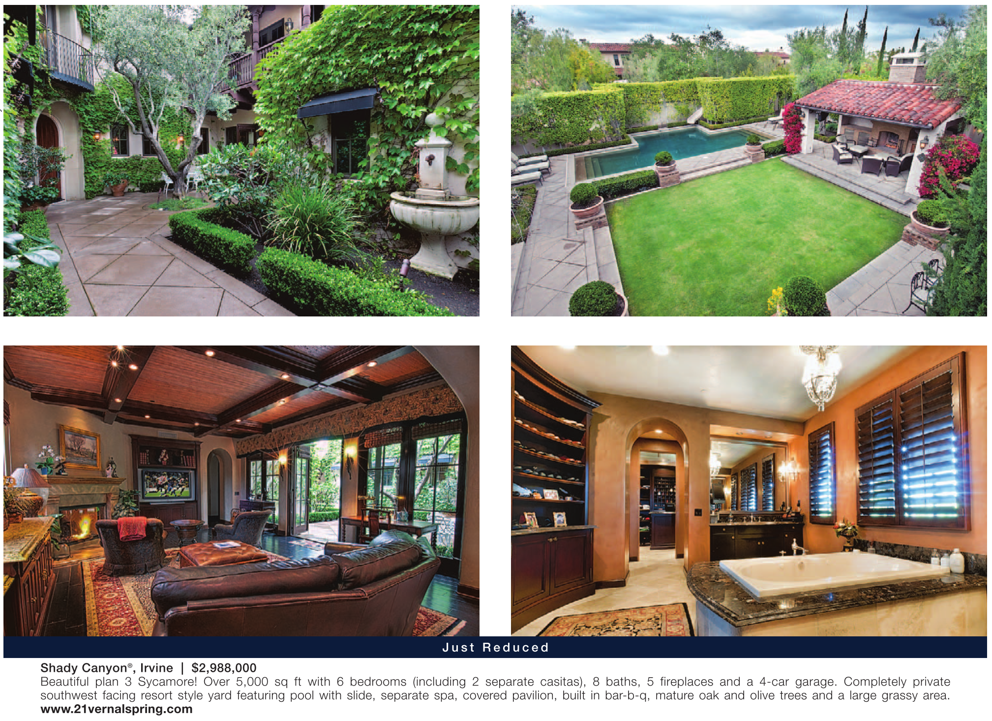 Just Reduced Shady Canyon ® , Irvine | $2,988,000 Beautiful plan 3 Sycamore! Over 5,000 sq ft with 6 bedrooms (including 2 separate casitas), 8 baths, 5 fireplaces and a 4-car garage. Completely private southwest facing resort style yard featuring pool with slide, separate spa, covered pavilion, built in bar-b-q, mature oak and olive trees and a large grassy area. www.21vernalspring.com