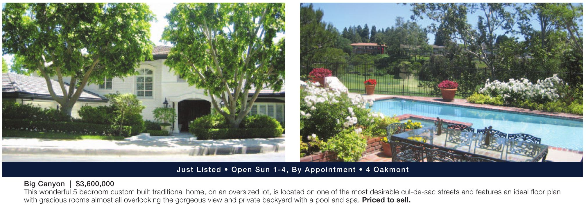 Big Canyon | $3,600,000 This wonderful 5 bedroom custom built traditional home, on an oversized lot, is located on one of the most desirable cul-de-sac streets and features an ideal floor plan with gracious rooms almost all overlooking the gorgeous view and private backyard with a pool and spa. Priced to sell.
