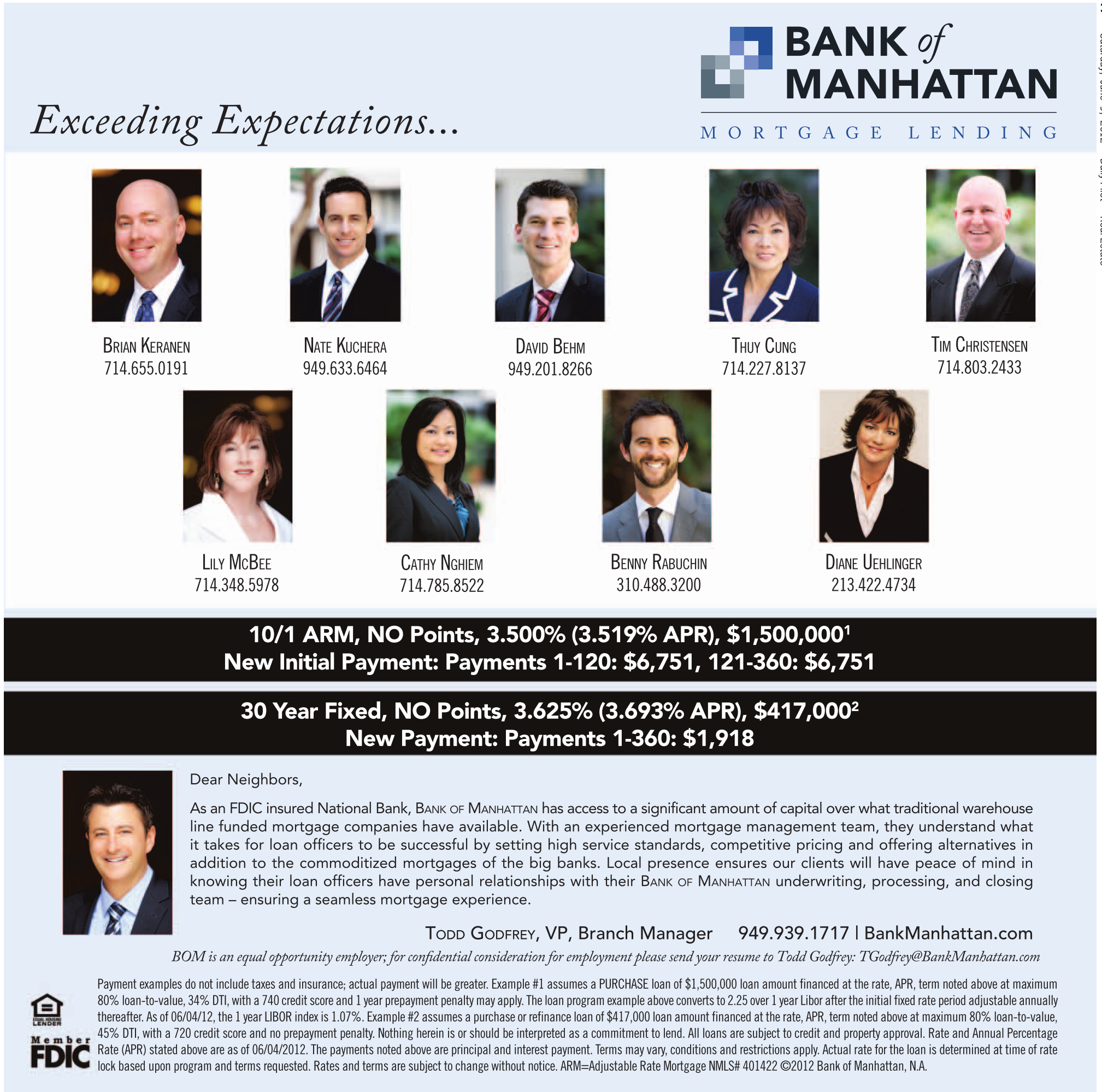 Payment examples do not include taxes and insurance; actual payment will be greater. Example #1 assumes a PURCHASE loan of $1,500,000 loan amount financed at the rate, APR, term noted above at maximum 80% loan-to-value, 34% DTI, with a 740 credit score and 1 year prepayment penalty may apply. The loan program example above converts to 2.25 over 1 year Libor after the initial fixed rate period adjustable annually thereafter. As of 06/04/12, the 1 year LIBOR index is 1.07%. Example #2 assumes a purchase or refinance loan of $417,000 loan amount financed at the rate, APR, term noted above at maximum 80% loan-to-value, 45% DTI, with a 720 credit score and no prepayment penalty. Nothing herein is or should be interpreted as a commitment to lend. All loans are subject to credit and property approval. Rate and Annual Percentage Rate (APR) stated above are as of 06/04/2012. The payments noted above are principal and interest payment. Terms may vary, conditions and restrictions apply. Actual rate for the loan is determined at time of rate lock based upon program and terms requested. Rates and terms are subject to change without notice. ARM=Adjustable Rate Mortgage NMLS# 401422 ©2012 Bank of Manhattan, N.A.