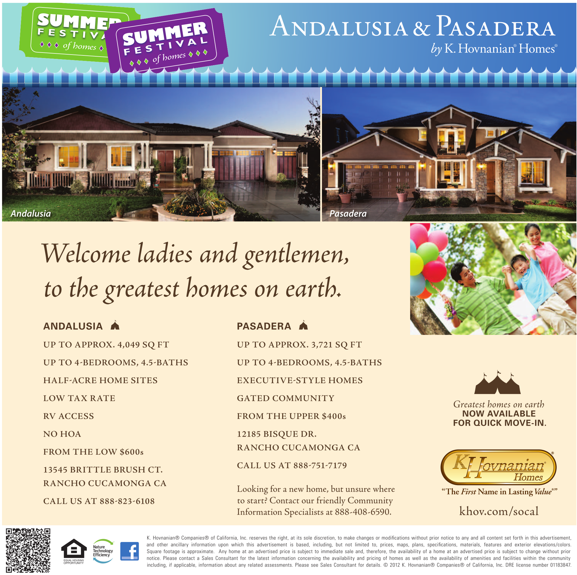 K. Hovnanian® Companies® of California, Inc. reserves the right, at its sole discretion, to make changes or modifi cations without prior notice to any and all content set forth in this advertisement, and other ancillary information upon which this advertisement is based, including, but not limited to, prices, maps, plans, specifi cations, materials, features and exterior elevations/colors. Square footage is approximate. Any home at an advertised price is subject to immediate sale and, therefore, the availability of a home at an advertised price is subject to change without prior notice. Please contact a Sales Consultant for the latest information concerning the availability and pricing of homes as well as the availability of amenities and facilities within the community including, if applicable, information about any related assessments. Please see Sales Consultant for details. © 2012 K. Hovnanian® Companies® of California, Inc. DRE license number 01183847.