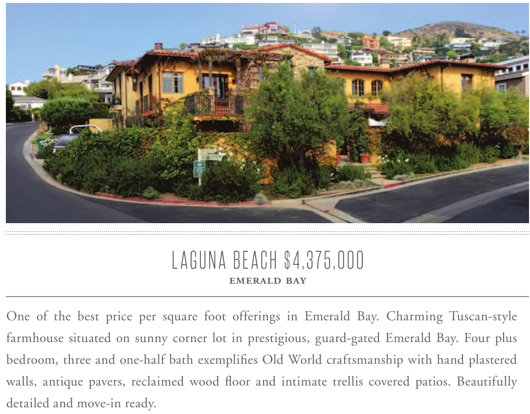 LAGUNA BEACH $4,375,000 emerald bay One of the best price per square foot offerings in Emerald Bay. Charming Tuscan-style farmhouse situated on sunny corner lot in prestigious, guard-gated Emerald Bay. Four plus bedroom, three and one-half bath exemplifies Old World craftsmanship with hand plastered walls, antique pavers, reclaimed wood floor and intimate trellis covered patios. Beautifully detailed and move-in ready.