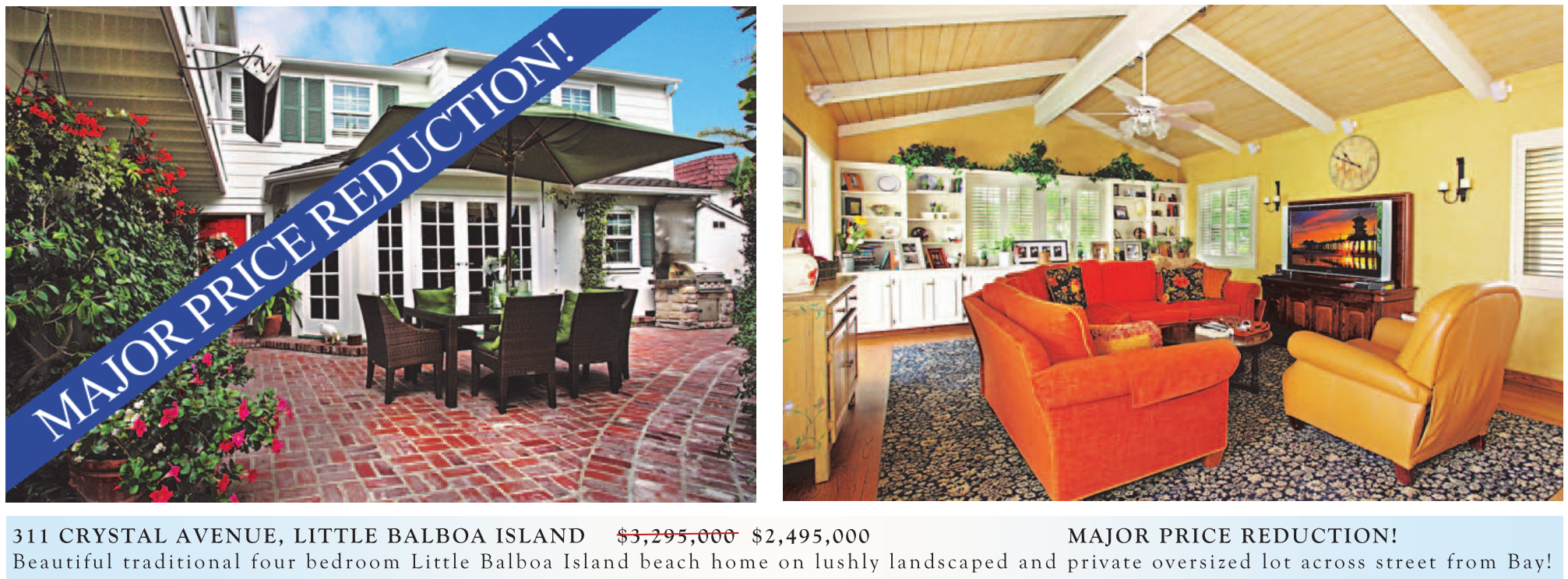 311 CRYSTAL AVENUE, LITTLE BALBOA ISLAND $3,295,000 $2,495,000 MAJOR PRICE REDUCTION! Beautiful traditional four bedroom Little Balboa Island beach home on lushly landscaped and private oversized lot across street from Bay!