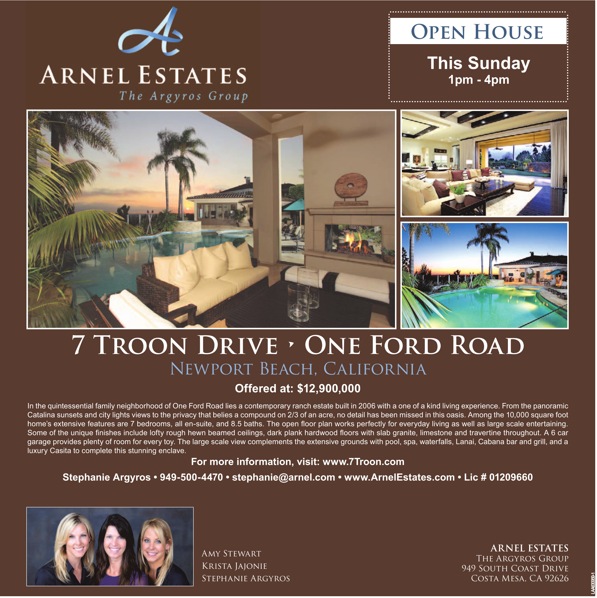 Open House This Sunday 1pm - 4pm 7 Troon Drive • One Ford Road Newport Beach, California Offered at: $12,900,000 In the quintessential family neighborhood of One Ford Road lies a contemporary ranch estate built in 2006 with a one of a kind living experience. From the panoramic Catalina sunsets and city lights views to the privacy that belies a compound on 2/3 of an acre, no detail has been missed in this oasis. Among the 10,000 square foot home’s extensive features are 7 bedrooms, all en-suite, and 8.5 baths. The open fl oor plan works perfectly for everyday living as well as large scale entertaining. Some of the unique fi nishes include lofty rough hewn beamed ceilings, dark plank hardwood fl oors with slab granite, limestone and travertine throughout. A 6 car garage provides plenty of room for every toy. The large scale view complements the extensive grounds with pool, spa, waterfalls, Lanai, Cabana bar and grill, and a luxury Casita to complete this stunning enclave. For more information, visit: www.7Troon.com Stephanie Argyros • 949-500-4470 • stephanie@arnel.com • www.ArnelEstates.com • Lic # 01209660 Amy Stewart Krista Jajonie Stephanie Argyros ARNEL ESTATES The Argyros Group 949 South Coast Drive Costa Mesa, CA 92626
