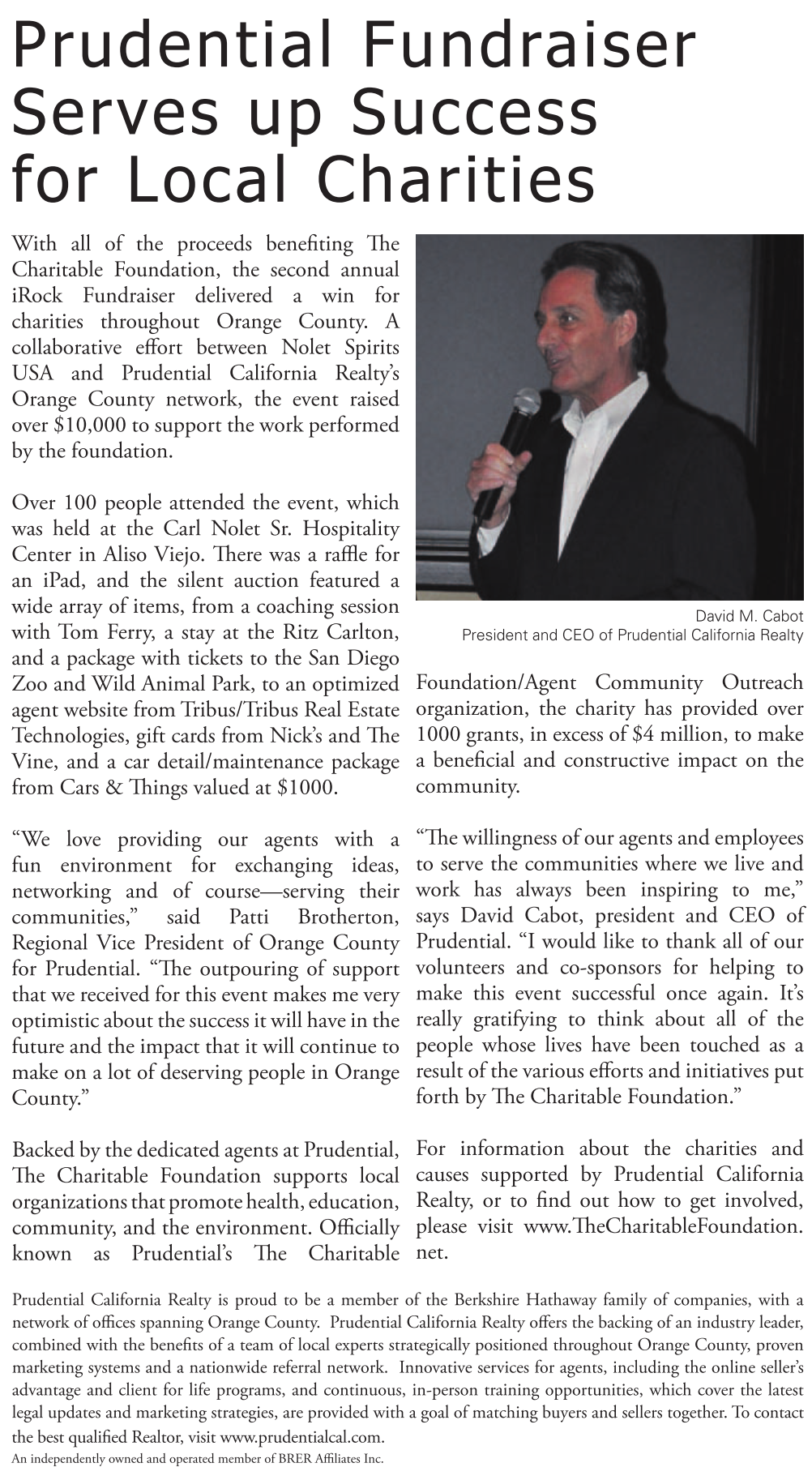 With all of the proceeds benefiting The Charitable Foundation, the second annual iRock Fundraiser delivered a win for charities throughout Orange County. A collaborative effort between Nolet Spirits USA and Prudential California Realty’s Orange County network, the event raised over $10,000 to support the work performed by the foundation.