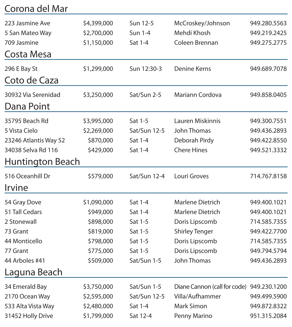34 Emerald Bay $3,750,000 Sat/Sun 1-5 Diane Cannon (call for code) 949.230.1200 2170 Ocean Way $2,595,000 Sat/Sun 12-5 Villa/Aufhammer 949.499.5900 533 Alta Vista Way $2,480,000 Sat 1-4 Mark Simon 949.872.8322 31452 Holly Drive $1,799,000 Sat 12-4 Penny Marino 951.315.2084