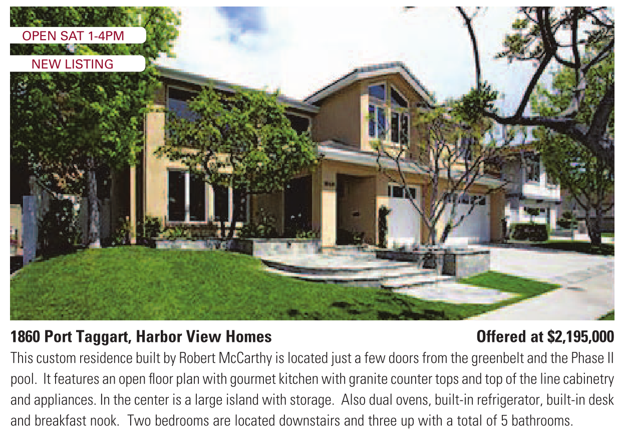 OPEN SAT 1-4PM NEW LISTING 1860 Port Taggart, Harbor View Homes Offered at $2,195,000 This custom residence built by Robert McCarthy is located just a few doors from the greenbelt and the Phase II pool. It features an open floor plan with gourmet kitchen with granite counter tops and top of the line cabinetry and appliances. In the center is a large island with storage. Also dual ovens, built-in refrigerator, built-in desk and breakfast nook. Two bedrooms are located downstairs and three up with a total of 5 bathrooms.