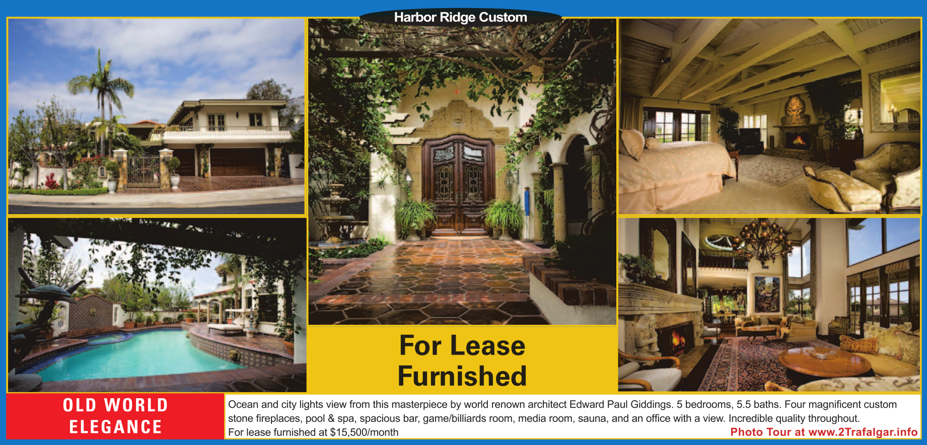 Ocean and city lights view from this masterpiece by world renown architect Edward Paul Giddings. 5 bedrooms, 5.5 baths. Four magnificent custom stone fireplaces, pool & spa, spacious bar, game/billiards room, media room, sauna, and an office with a view. Incredible quality throughout. For lease furnished at $15,500/month Photo Tour at www.2Trafalgar.info