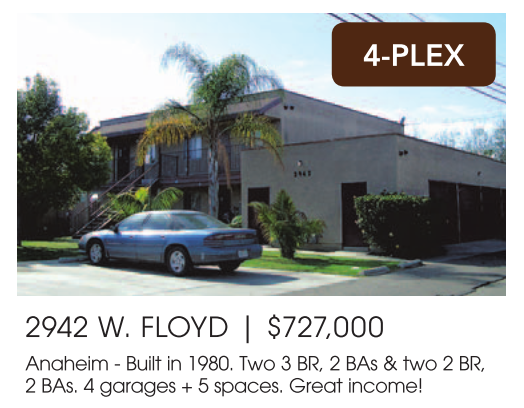 Anaheim - Built in 1980. Two 3 BR, 2 BAs & two 2 BR, 2 BAs. 4 garages + 5 spaces. Great income!