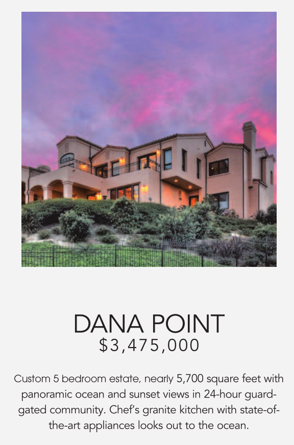 Custom 5 bedroom estate, nearly 5,700 square feet with panoramic ocean and sunset views in 24-hour guardgated community. Chef’s granite kitchen with state-ofthe-art appliances looks out to the ocean.
