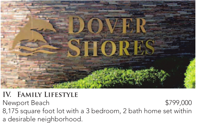 IV. Family Lifestyle Newport Beach $799,000 8,175 square foot lot with a 3 bedroom, 2 bath home set within a desirable neighborhood.