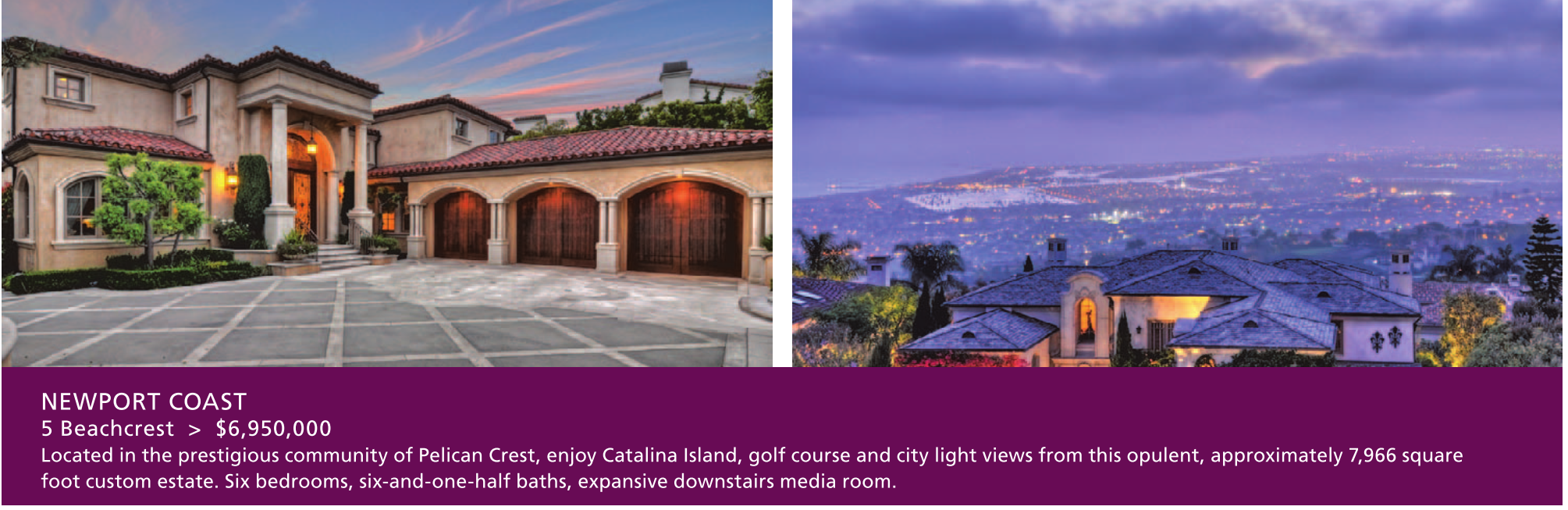 NEWPORT COAST 5 Beachcrest > $6,950,000 Located in the prestigious community of Pelican Crest, enjoy Catalina Island, golf course and city light views from this opulent, approximately 7,966 square foot custom estate. Six bedrooms, six-and-one-half baths, expansive downstairs media room.