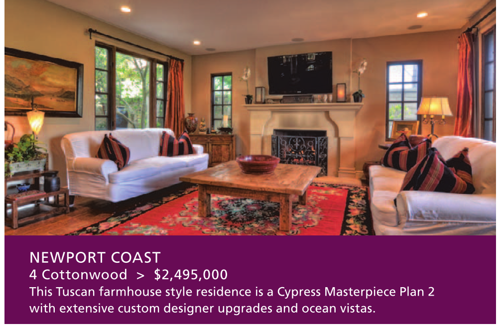 NEWPORT COAST 4 Cottonwood > $2,495,000 This Tuscan farmhouse style residence is a Cypress Masterpiece Plan 2 with extensive custom designer upgrades and ocean vistas.
