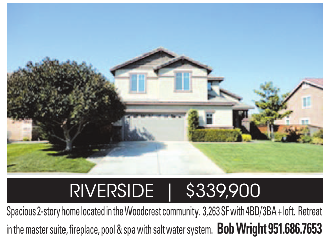 Spacious 2-story home located in the Woodcrest community. 3,263 SF with 4BD/3BA + loft. Retreat in the master suite, fireplace, pool & spa with salt water system. Bob Wright 951.686.7653