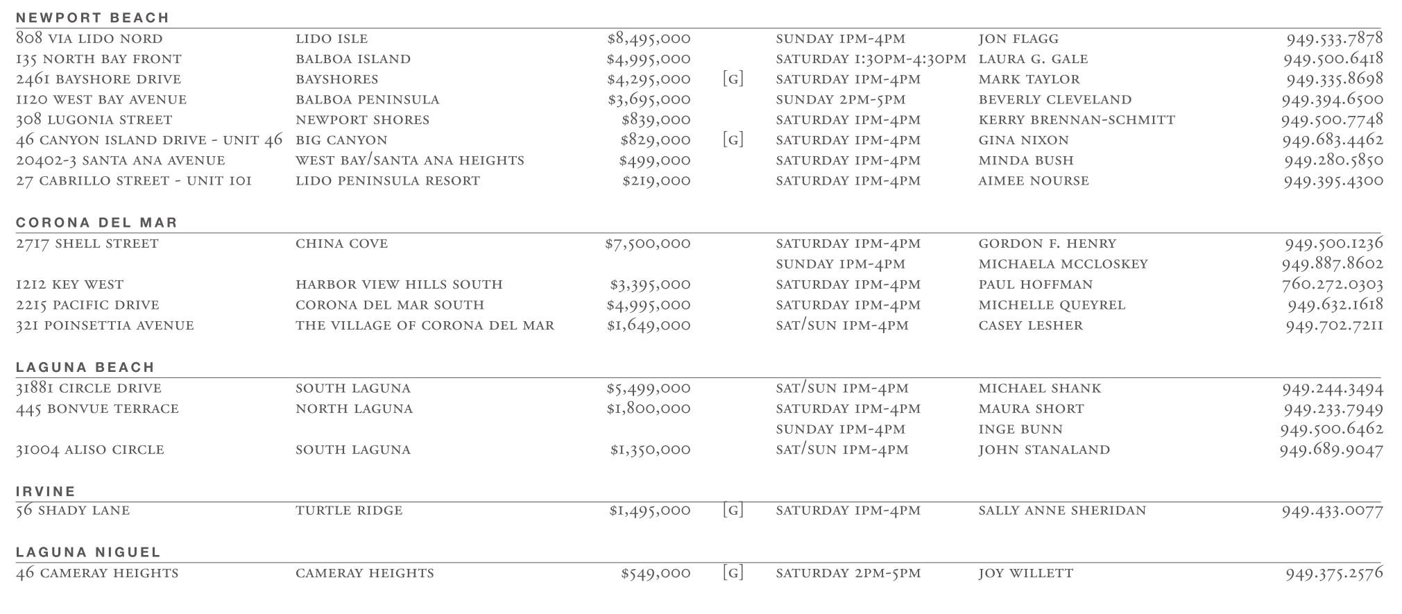 CORONA DEL MAR 2717 shell street china cove $7,500,000 saturday 1pm-4pm gordon f. henry 949.500.1236 sunday 1pm-4pm michaela mccloskey 949.887.8602 1212 key west harbor view hills south $3,395,000 saturday 1pm-4pm paul hoffman 760.272.0303 2215 pacific drive corona del mar south $4,995,000 saturday 1pm-4pm michelle queyrel 949.632.1618 321 poinsettia avenue the village of corona del mar $1,649,000 sat/sun 1pm-4pm casey lesher 949.702.7211