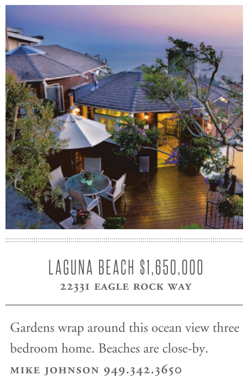 Gardens wrap around this ocean view three bedroom home. Beaches are close-by. mike johnson 949.342.3650