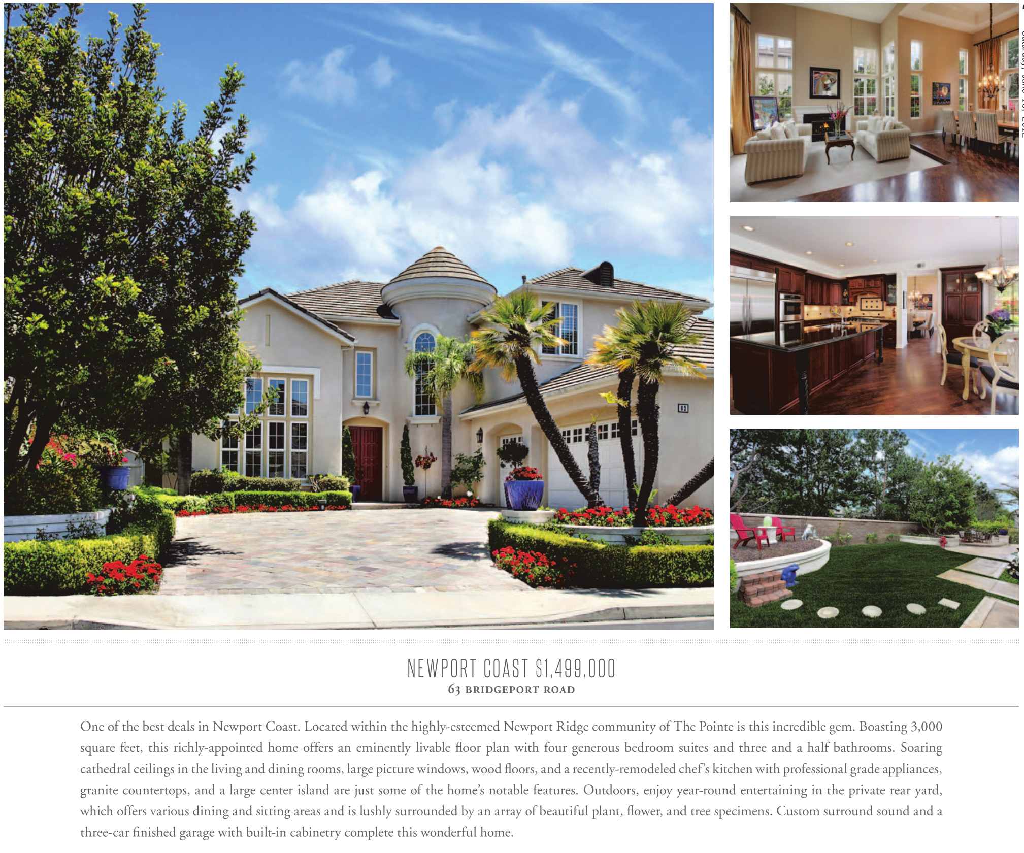43 NEWPORT COAST $1,499,000 63 bridgeport road One of the best deals in Newport Coast. Located within the highly-esteemed Newport Ridge community of The Pointe is this incredible gem. Boasting 3,000 square feet, this richly-appointed home offers an eminently livable floor plan with four generous bedroom suites and three and a half bathrooms. Soaring cathedral ceilings in the living and dining rooms, large picture windows, wood floors, and a recently-remodeled chef’s kitchen with professional grade appliances, granite countertops, and a large center island are just some of the home’s notable features. Outdoors, enjoy year-round entertaining in the private rear yard, which offers various dining and sitting areas and is lushly surrounded by an array of beautiful plant, flower, and tree specimens. Custom surround sound and a three-car finished garage with built-in cabinetry complete this wonderful home.
