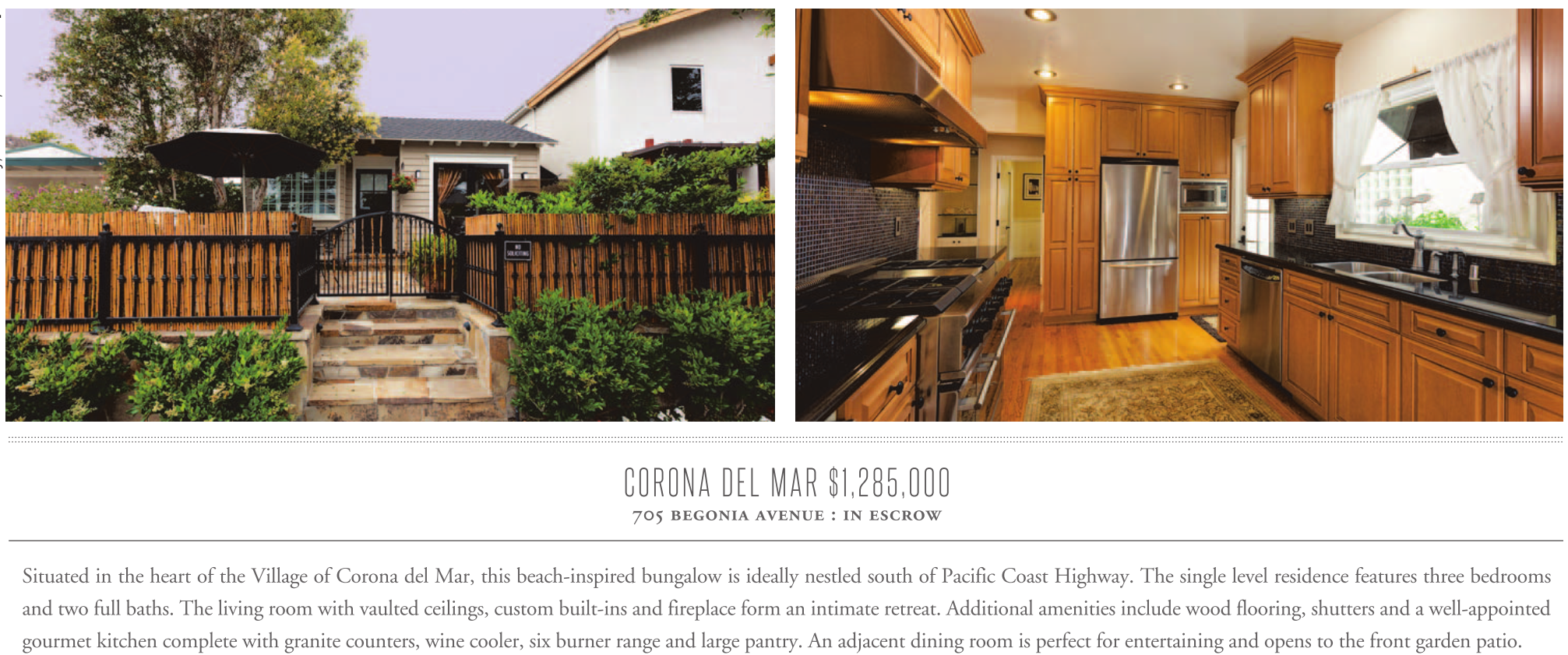 Situated in the heart of the Village of Corona del Mar, this beach-inspired bungalow is ideally nestled south of Pacific Coast Highway. The single level residence features three bedrooms and two full baths. The living room with vaulted ceilings, custom built-ins and fireplace form an intimate retreat. Additional amenities include wood flooring, shutters and a well-appointed gourmet kitchen complete with granite counters, wine cooler, six burner range and large pantry. An adjacent dining room is perfect for entertaining and opens to the front garden patio.