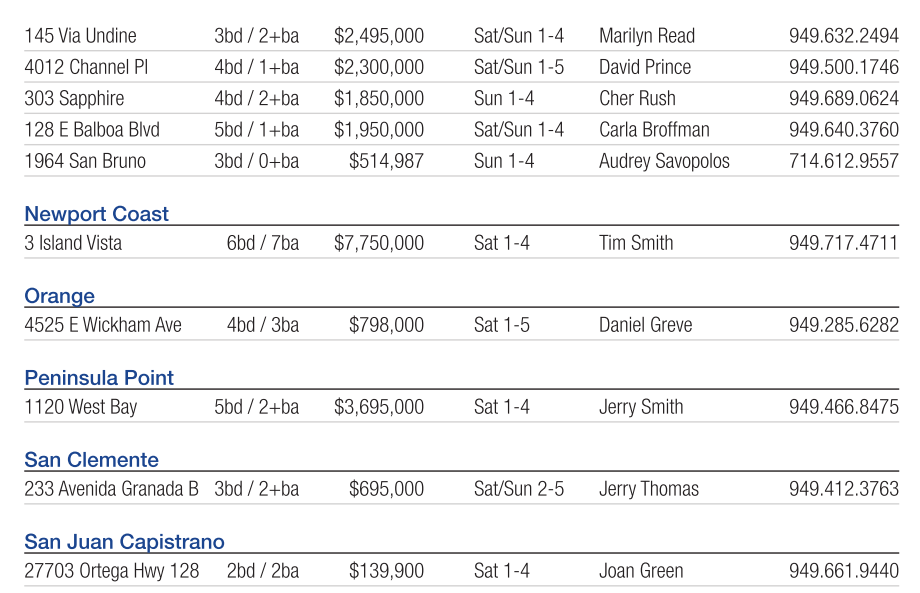 145 Via Undine 3bd / 2+ba $2,495,000 Sat/Sun 1-4 Marilyn Read 949.632.2494 4012 Channel Pl 4bd / 1+ba $2,300,000 Sat/Sun 1-5 David Prince 949.500.1746 303 Sapphire 4bd / 2+ba $1,850,000 Sun 1-4 Cher Rush 949.689.0624 128 E Balboa Blvd 5bd / 1+ba $1,950,000 Sat/Sun 1-4 Carla Broffman 949.640.3760 1964 San Bruno 3bd / 0+ba $514,987 Sun 1-4 Audrey Savopolos 714.612.9557 Newport Coast 3 Island Vista 6bd / 7ba $7,750,000 Sat 1-4 Tim Smith 949.717.4711 Orange 4525 E Wickham Ave 4bd / 3ba $798,000 Sat 1-5 Daniel Greve 949.285.6282 Peninsula Point 1120 West Bay 5bd / 2+ba $3,695,000 Sat 1-4 Jerry Smith 949.466.8475 San Clemente 233 Avenida Granada B 3bd / 2+ba $695,000 Sat/Sun 2-5 Jerry Thomas 949.412.3763 San Juan Capistrano 27703 Ortega Hwy 128 2bd / 2ba $139,900 Sat 1-4 Joan Green 949.661.9440