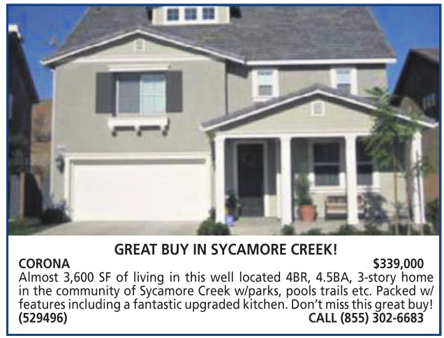 GREAT BUY IN SYCAMORE CREEK! CORONA $339,000 Almost 3,600 SF of living in this well located 4BR, 4.5BA, 3-story home in the community of Sycamore Creek w/parks, pools trails etc. Packed w/ features including a fantastic upgraded kitchen. Don’t miss this great buy! (529496) CALL (855) 302-6683