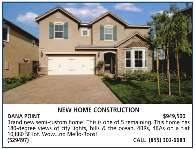 NEW HOME CONSTRUCTION DANA POINT $949,500 Brand new semi-custom home! This is one of 5 remaining. This home has 180-degree views of city lights, hills & the ocean. 4BRs, 4BAs on a flat 10,880 SF lot. Wow...no Mello-Roos! (529497) CALL (855) 302-6683