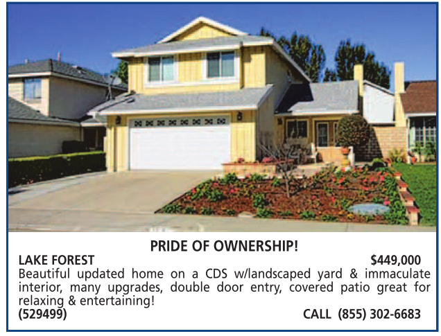 LAKE FOREST $449,000 Beautiful updated home on a CDS w/landscaped yard & immaculate interior, many upgrades, double door entry, covered patio great for relaxing & entertaining! (529499) CALL (855) 302-6683