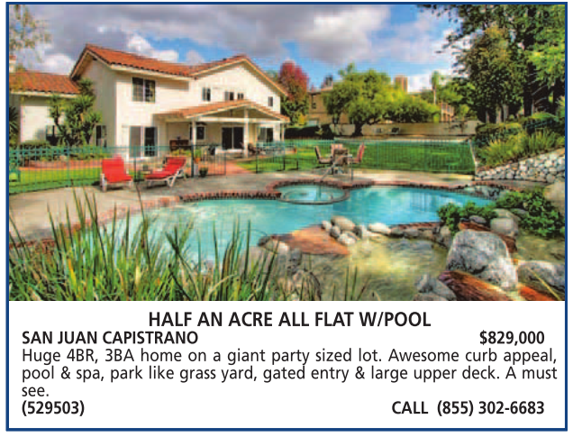HALF AN ACRE ALL FLAT W/POOL SAN JUAN CAPISTRANO $829,000 Huge 4BR, 3BA home on a giant party sized lot. Awesome curb appeal, pool & spa, park like grass yard, gated entry & large upper deck. A must see. (529503) CALL (855) 302-6683