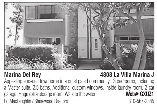 Marina Del Rey 4808 La Villa Marina J Appealing end-unit townhome in a quiet gated community. 3 bedrooms, including a Master suite. 2.5 baths. Additional custom windows. Inside laundry room, 2-car garage. Huge extra storage room. Walk to the water Web# GXUZ1 Ed MacLaughlin / Shorewood Realtors 310-567-2385