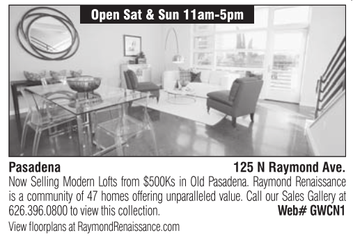 Open Sat & Sun 11am-5pm Pasadena 125 N Raymond Ave. Now Selling Modern Lofts from $500Ks in Old Pasadena. Raymond Renaissance is a community of 47 homes offering unparalleled value. Call our Sales Gallery at 626.396.0800 to view this collection. Web# GWCN1 View floorplans at RaymondRenaissance.com