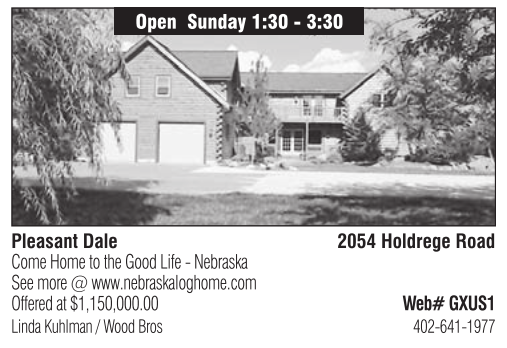 Pleasant Dale 2054 Holdrege Road Come Home to the Good Life - Nebraska See more @ www.nebraskaloghome.com Offered at $1,150,000.00 Web# GXUS1 Linda Kuhlman / Wood Bros 402-641-1977