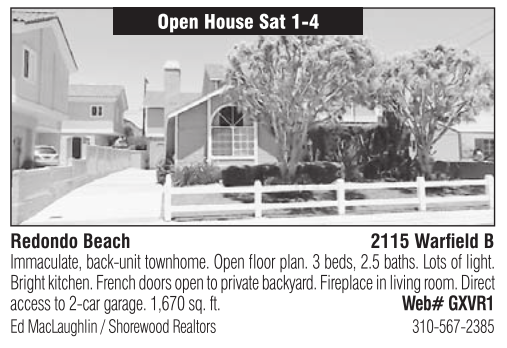 Open House Sat 1-4 Redondo Beach 2115 Warfield B Immaculate, back-unit townhome. Open floor plan. 3 beds, 2.5 baths. Lots of light. Bright kitchen. French doors open to private backyard. Fireplace in living room. Direct access to 2-car garage. 1,670 sq. ft. Web# GXVR1 Ed MacLaughlin / Shorewood Realtors 310-567-2385