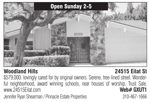 Open Sunday 2-5 Woodland Hills 24515 Eilat St $579,000. lovingly cared for by original owners. Serene, tree-lined street. Wonderful neighborhood, award winning schools, near houses of worship. Trust Sale. www.24515Eilat.com Web# GXUT1 Jennifer Ryan Shearman / Pinnacle Estate Properties 310-467-1666