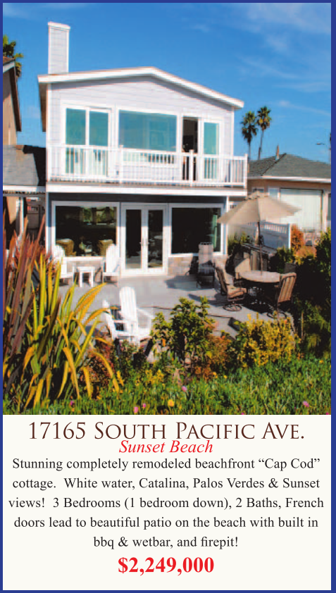 Stunning completely remodeled beachfront “Cap Cod” cottage. White water, Catalina, Palos Verdes & Sunset views! 3 Bedrooms (1 bedroom down), 2 Baths, French doors lead to beautiful patio on the beach with built in bbq & wetbar, and firepit!