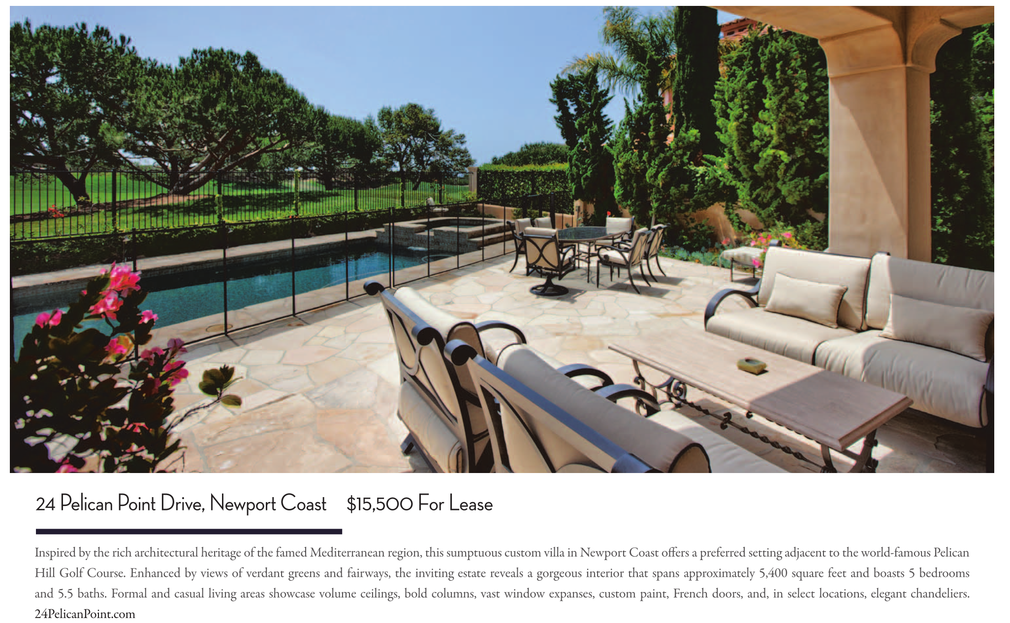 Inspired by the rich architectural heritage of the famed Mediterranean region, this sumptuous custom villa in Newport Coast offers a preferred setting adjacent to the world-famous Pelican Hill Golf Course. Enhanced by views of verdant greens and fairways, the inviting estate reveals a gorgeous interior that spans approximately 5,400 square feet and boasts 5 bedrooms and 5.5 baths. Formal and casual living areas showcase volume ceilings, bold columns, vast window expanses, custom paint, French doors, and, in select locations, elegant chandeliers. 24PelicanPoint.com
