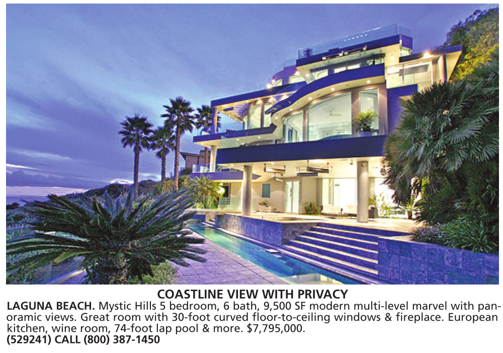 COASTLINE VIEW WITH PRIVACY LAGUNA BEACH. Mystic Hills 5 bedroom, 6 bath, 9,500 SF modern multi-level marvel with panoramic views. Great room with 30-foot curved floor-to-ceiling windows & fireplace. European kitchen, wine room, 74-foot lap pool & more. $7,795,000. (529241) CALL (800) 387-1450