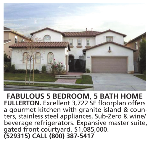 FABULOUS 5 BEDROOM, 5 BATH HOME FULLERTON. Excellent 3,722 SF floorplan offers a gourmet kitchen with granite island & counters, stainless steel appliances, Sub-Zero & wine/ beverage refrigerators. Expansive master suite, gated front courtyard. $1,085,000. (529315) CALL (800) 387-5417