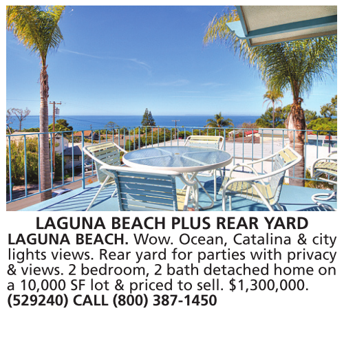LAGUNA BEACH PLUS REAR YARD LAGUNA BEACH. Wow. Ocean, Catalina & city lights views. Rear yard for parties with privacy & views. 2 bedroom, 2 bath detached home on a 10,000 SF lot & priced to sell. $1,300,000. (529240) CALL (800) 387-1450